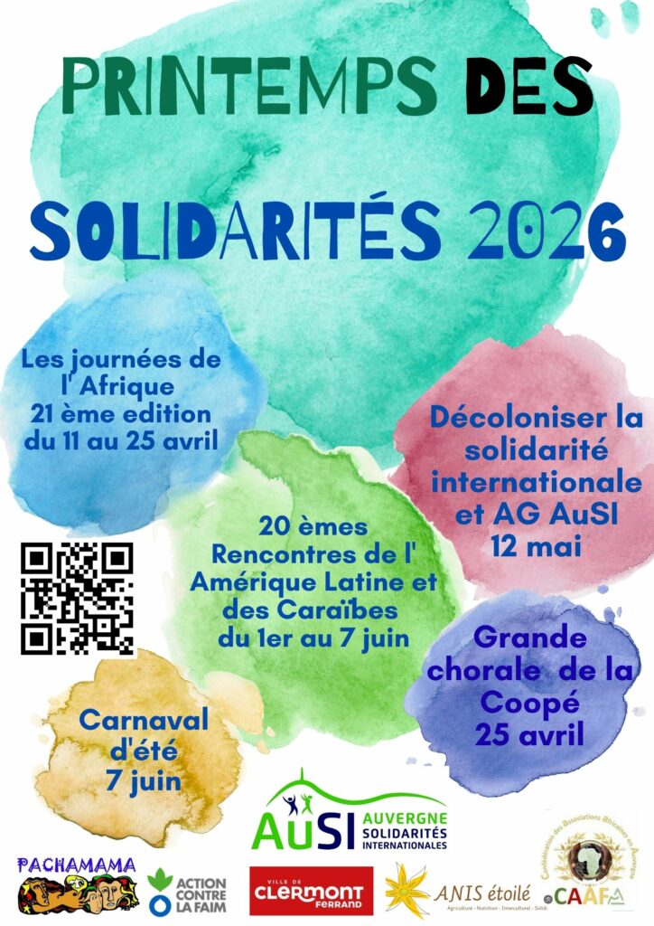 - 12 mai à 18h : Assemblée Générale d’Auvergne Solidarités Internationales (AuSI) au Lieu-dit, rue – Clermont-Ferrand avec un débat sur l’impact de la situation internationale et l’abandon du droit international sur les actions de solidarité et de partenariat international. Est-il possible de décoloniser la Solidarité Internationale dans un monde fracturé ?